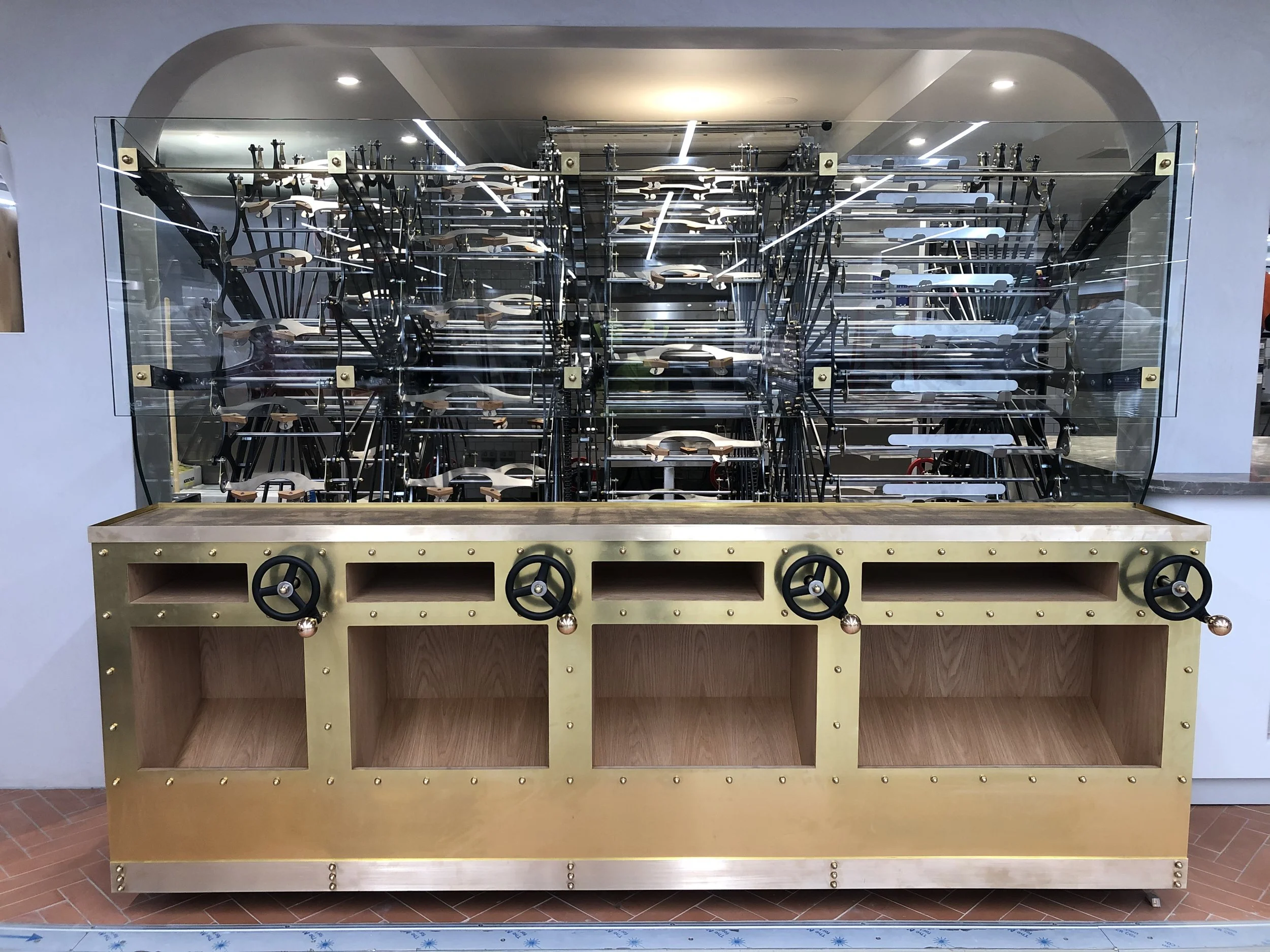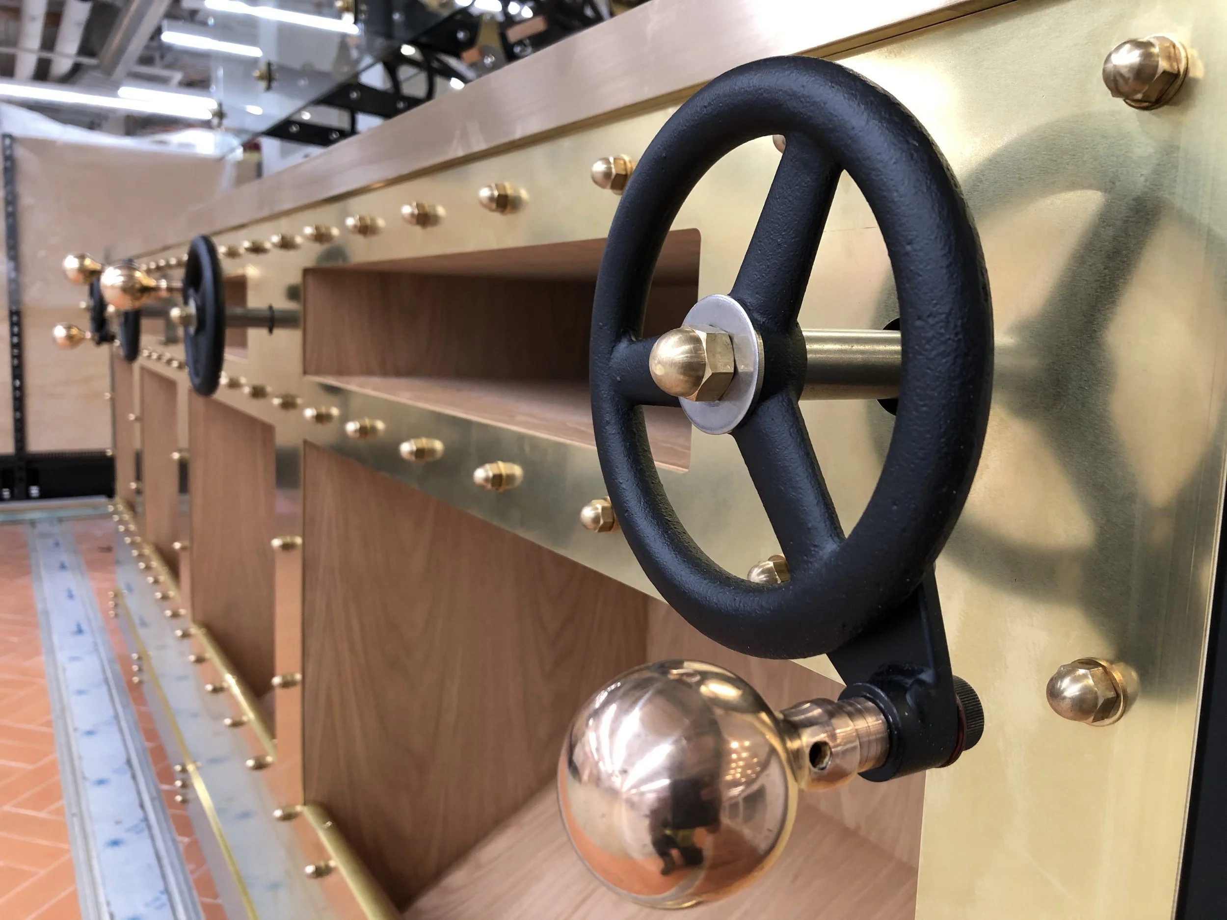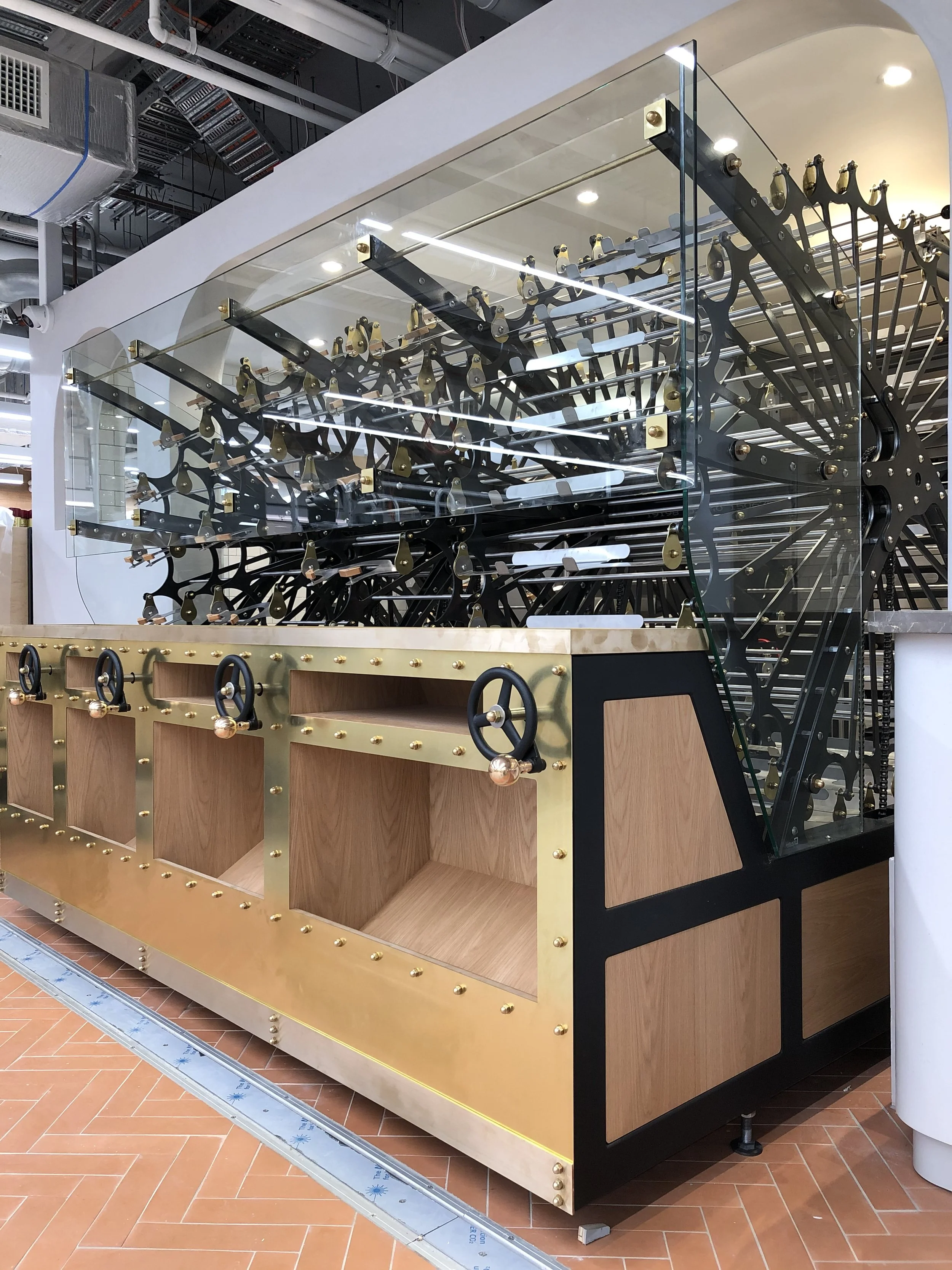 At the heart of the boulangerie stands a true showpiece — the Bread Wheel. More than just a display, it’s a revolving celebration of artisan baking and inventive design. Crafted with warm timber, intricate brass panelling and vintage industrial wheels that power its gentle rotation, the Bread Wheel brings together heritage engineering and high-end detailing, making it a jewelled element within the market space.